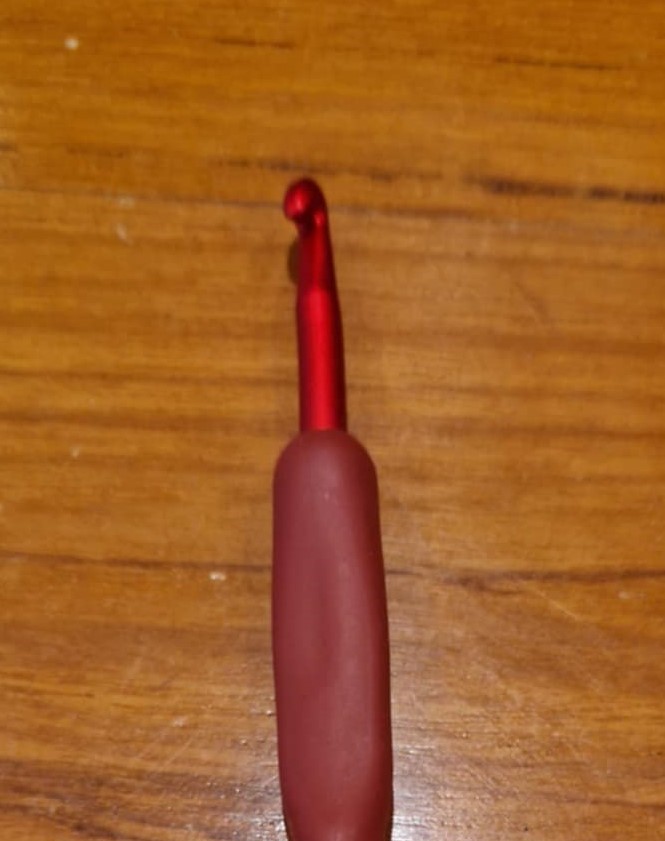 Rauð heklunál með góðu haldi.